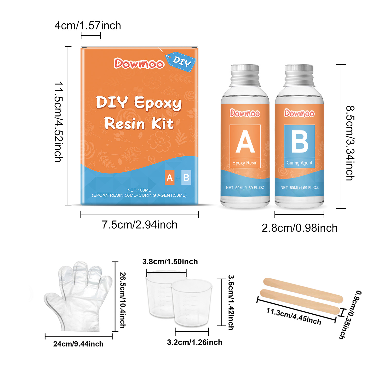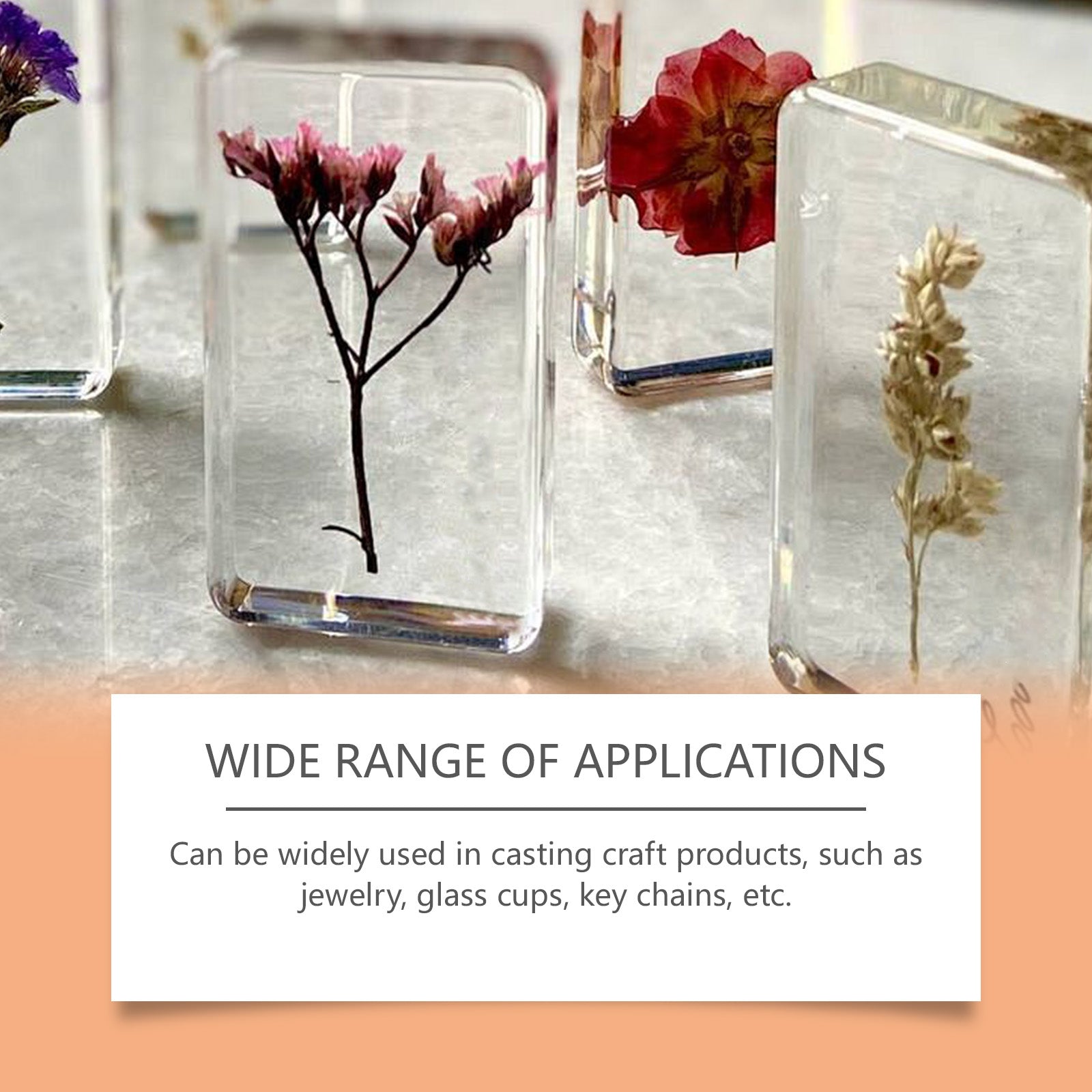 Our transparent epoxy resin kit is carefully formulated with epoxy resin and acrylic resin. Designed specifically for rapid curing and molding. The usage method is extremely convenient: Before starting to make, put on gloves and take equal amounts of epoxy resin and curing agent with a measuring cup. Use a stirring rod to slowly mix the epoxy resin and curing agent in a volume ratio of 1:1 for 4 to 6 minutes. Then pour the resin into the mold and wait for 8 hours to dry. And it can be widely used in casting process products, such as jewelry, glass cups, key chains, etc.